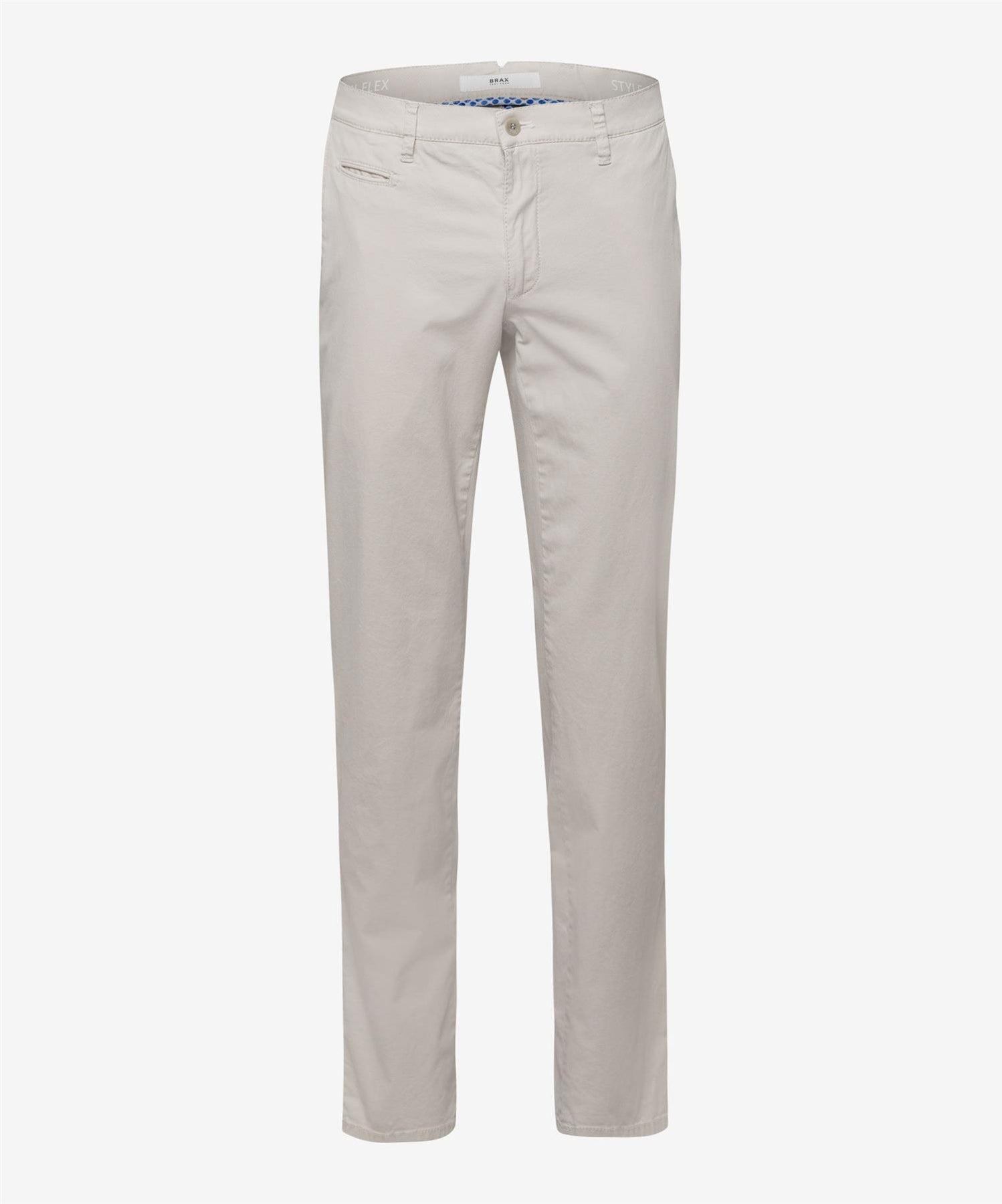 Style FABIO IN er et nøkkelstykke for menn.  Chinos er et blikkfang i en klassisk og avslappet look. Herrebukser med moderne passform er moderne og allsidige med smal passform og vanlig midjehøyde. Buksen har spesielt et typisk utseende med det eksklusive lommedesignet. I tillegg er de dekorert med dekorative nagler og kunstlærdekor. Bevegelse uten grenser: De ekstremt elastiske Hi-Flex-fibrene garanterer uendelig bevegelsesfrihet med High Stretch - eksklusivt fra BRAX. I tillegg er strukturen trygg og spennende, og sikrer materialets effektive utseende. Den bærekraftige, lettstelte og hudvennlige bomullsblandingen sikrer også perfekt bærekomfort for disse flate frontbuksene.