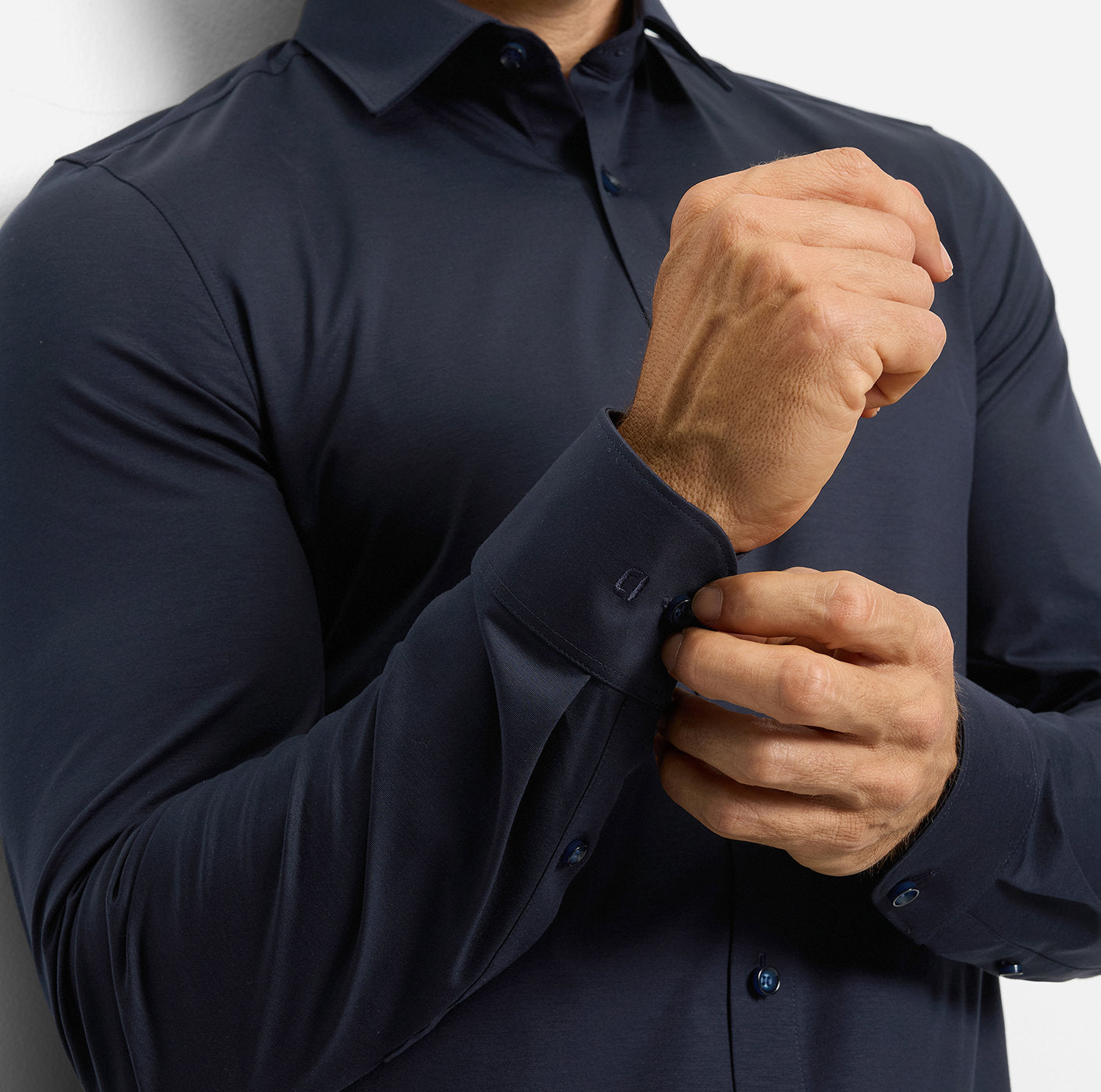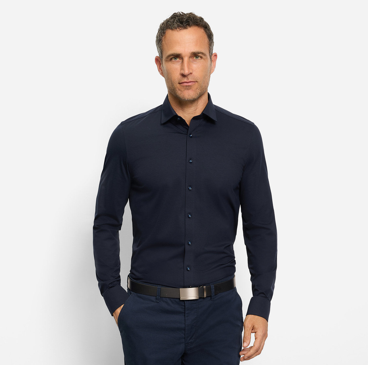 OLYMP Level Five 24/Seven business-skjorten, laget av Dynamic Flex Jersey, er tilgjengelig i ensfarget mørk blå og en rekke moderne farger. Stoffet er ultralett, svært elastisk, pustende, hurtigtørkende og enkelt å stryke. Den har en sporty-elegant silhuett, en myk Kent-passform og en avslappet avrundet kant.
