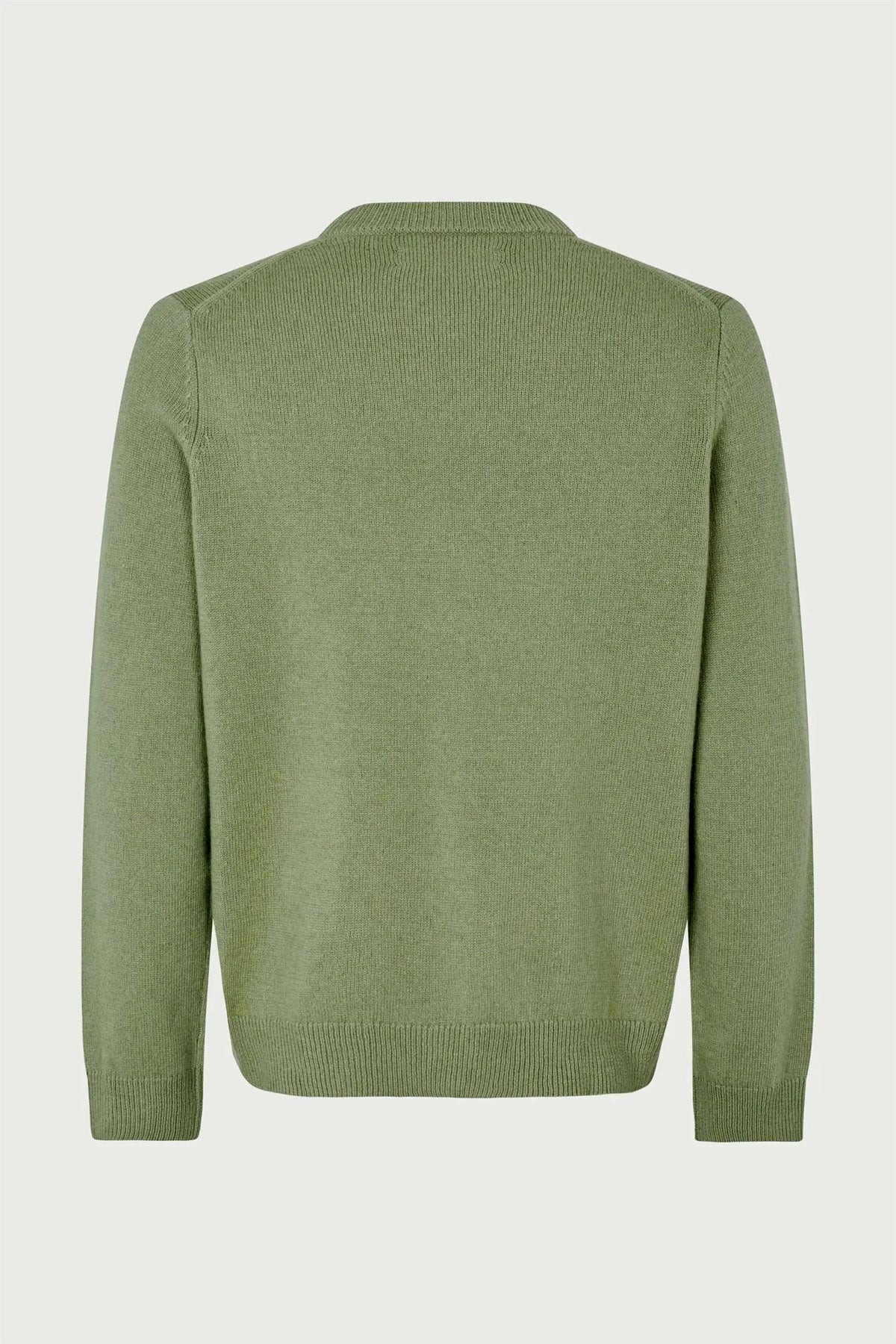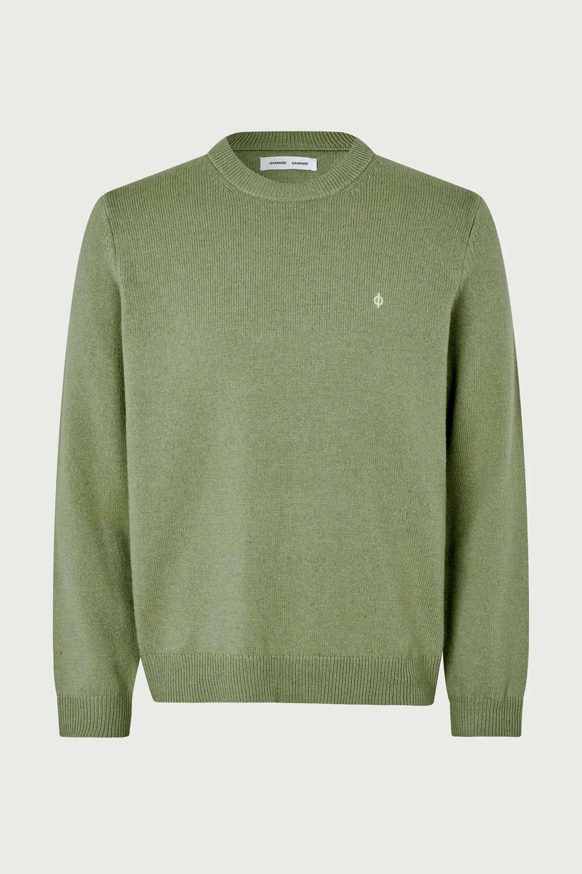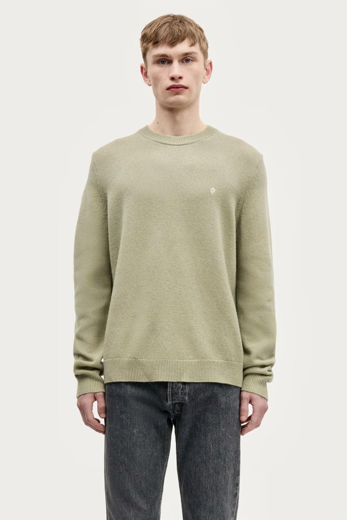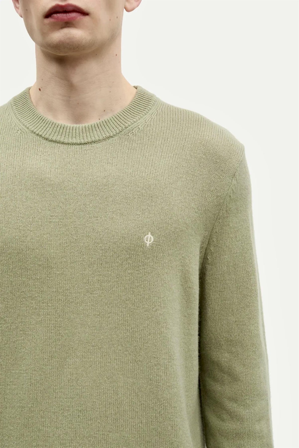 Genser med vanlig passform. Ribbestrikket krage, mansjetter og fald. Rund hals. Brodert ø-logo på brystet. Hovedmateriale laget av en ullblanding.