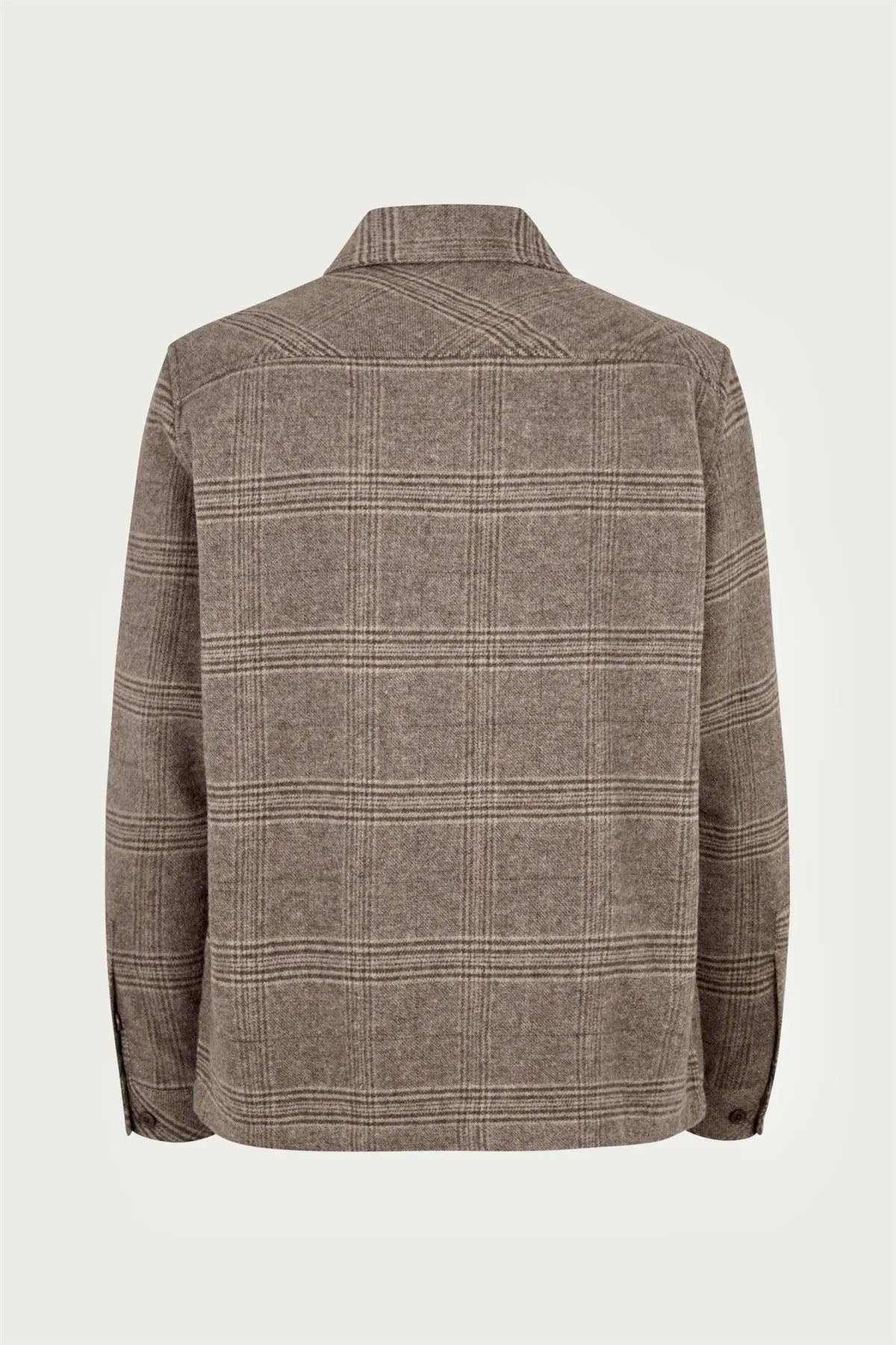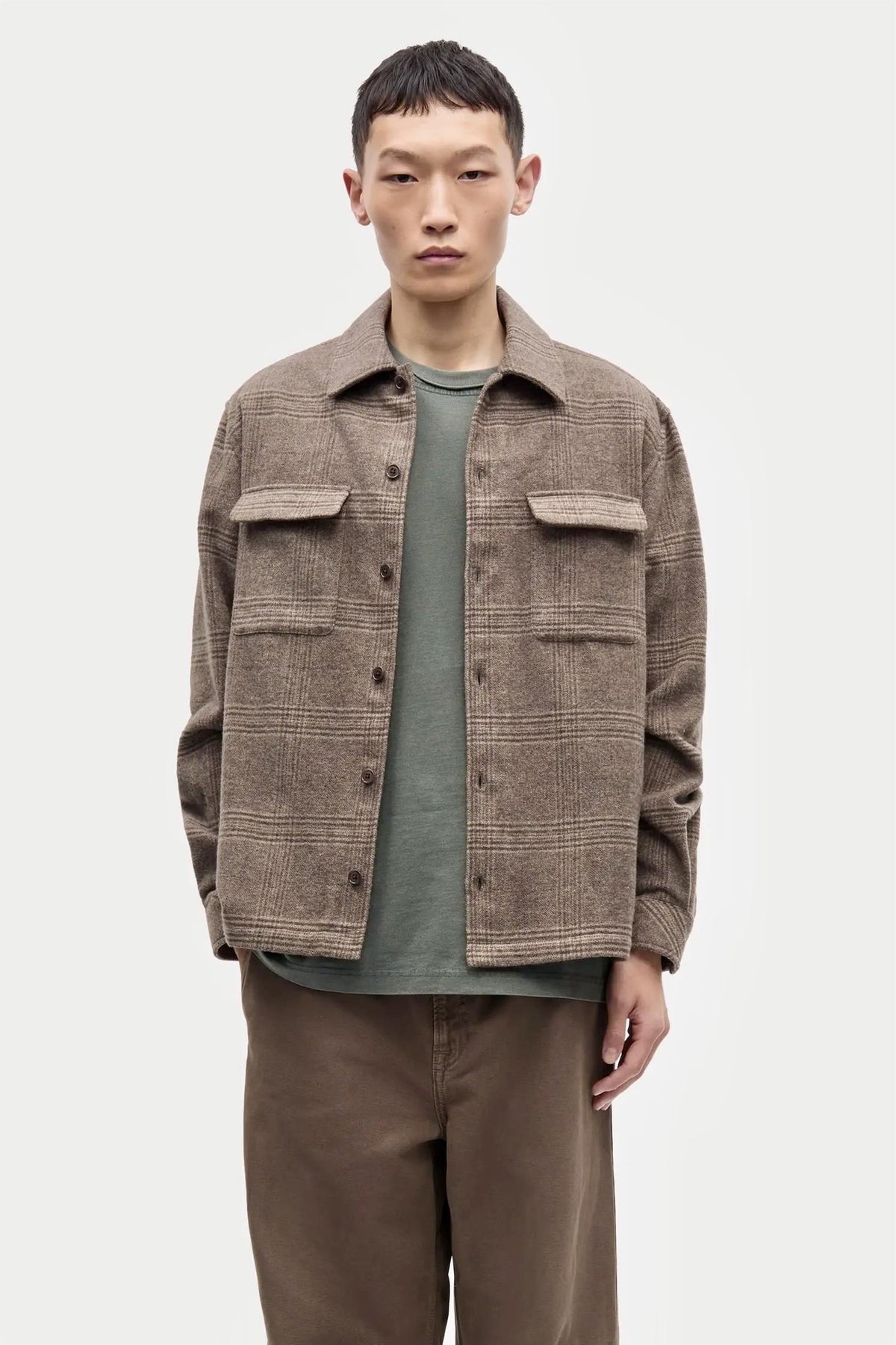 Langermet rutete overshirt med løs passform og lave skuldre. Knappelukking foran og mansjetter med knapper. Påsydde lommer med klaffer på brystet. Hovedmateriale vevd av en blanding av resirkulert akryl og resirkulert ull.