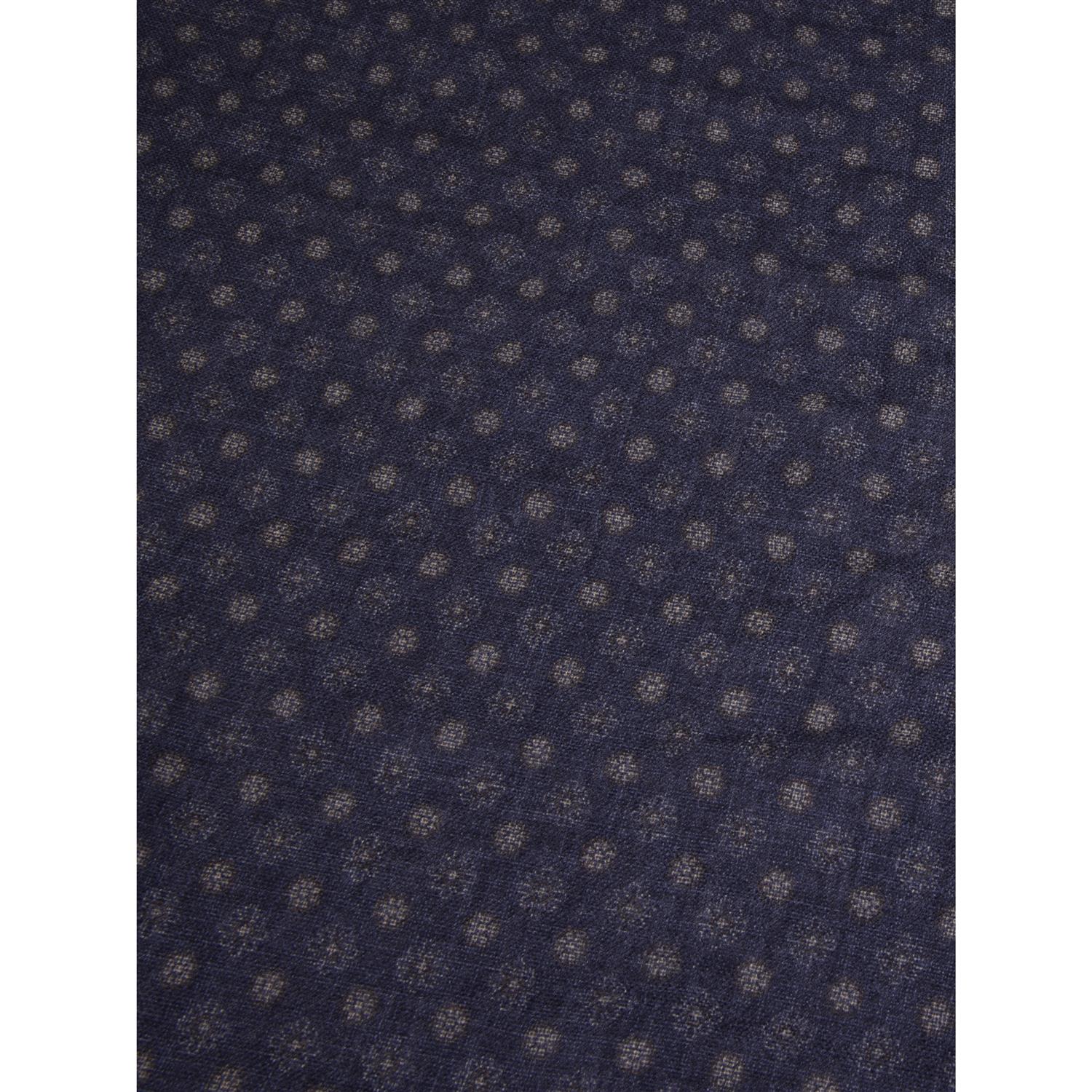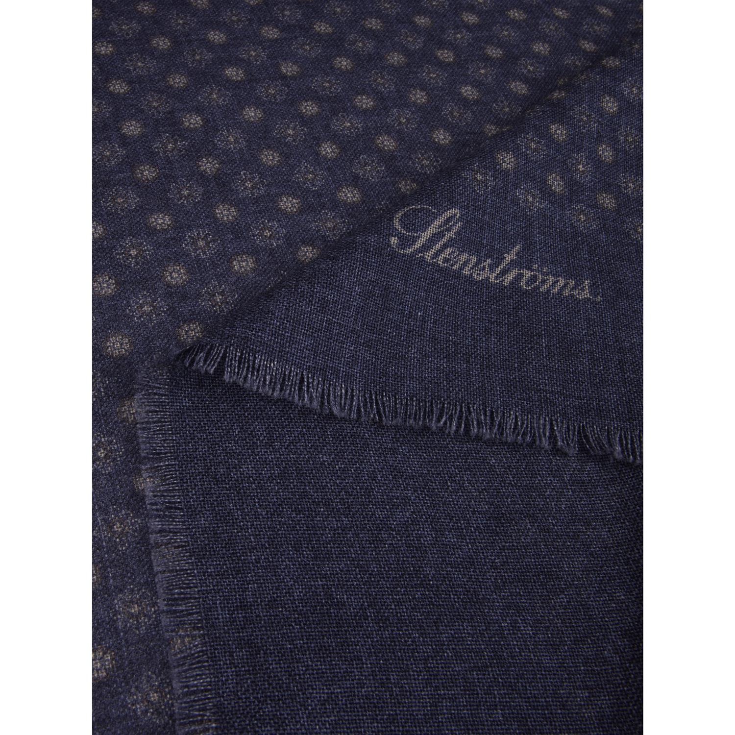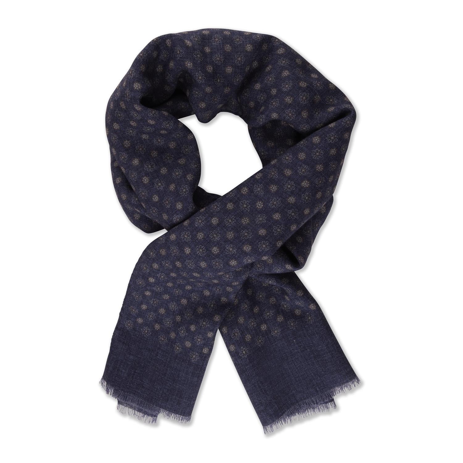 Dette marineskjerfet er laget av ull og er detaljert med et mønster.