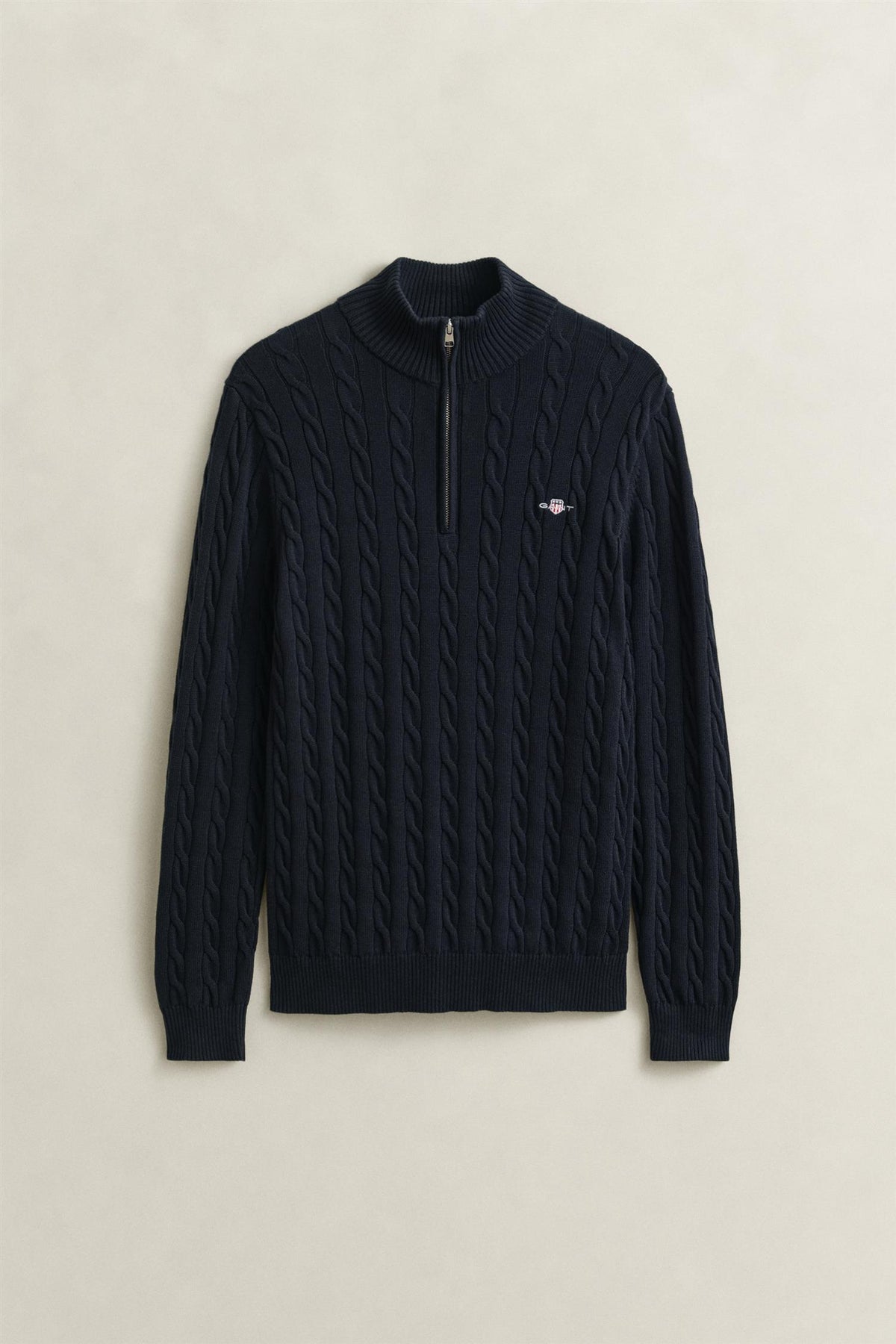 Designet i bomull med en gjennomgående kabelstrikket struktur, har denne myke genseren en normal passform og en sporty half-zip. En preppy essensiell, den er detaljert med vårt ikoniske GANT-skjold brodert på brystet, og ribbet avslutninger ved halsen, falden og mansjettene.